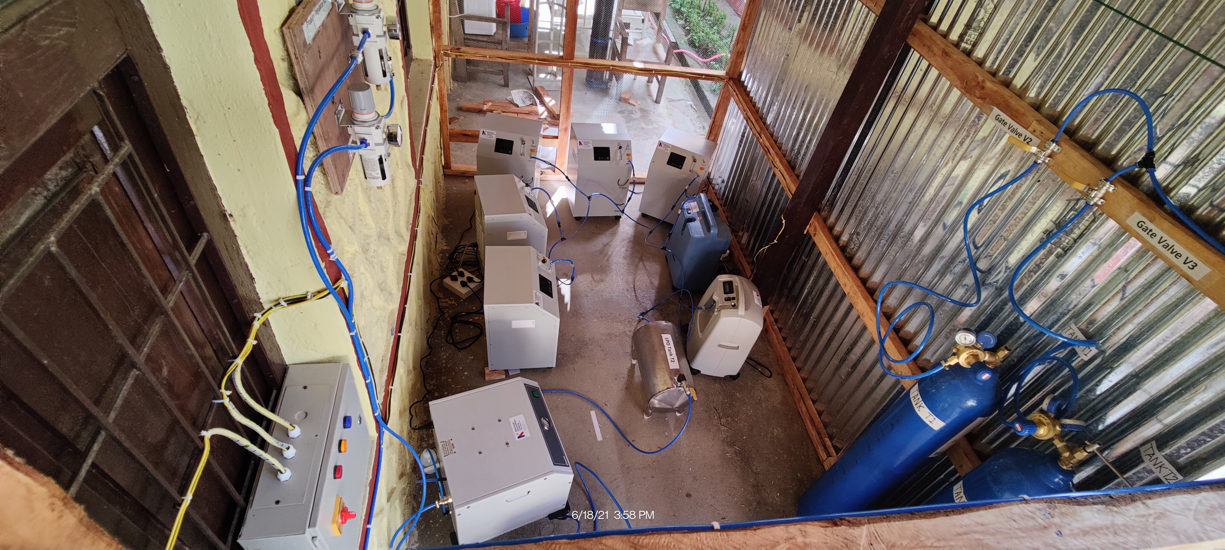 Oxygen generation is done by retrofitting 10 Lpm and 5 Lpm oxygen concentrators and oxygen delivery is done by fitting Polyurethane pipes and associated accessories for Medical Gas Pipeline System. The system will be capable of delivering 65 Lpm of oxygen to a maximum of 13 patients. A single patient may receive a maximum of 15 Lpm of oxygen with the net total oxygen consumption not exceeding 65 Lpm. The system harvests 65 Lpm of oxygen from low pressure oxygen concentrators, ramps it up to a high pressure of 3.5 bar using a medical air compressor and delivers it to the patient via the medical gas pipeline consisting of oxygen flowmeters. The system is also backed up by oxygen cylinders which ensure consistent uninterrupted delivery of oxygen during system failure.